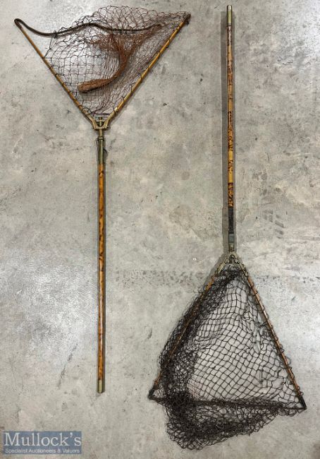 2x Period Folding Landing Nets, with burnt bamboo handless, brass fittings -1 has an unusual pull release mechanism to it, both unnamed