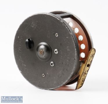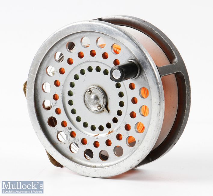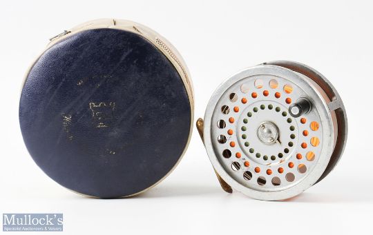 Hardy Bros Marquis Salmon No 2 Alloy Fly Reel 4 1/8" spool, 2 screw latch, black handle, rear tensioner, ribbed brass foot, with makers pouch, overall both well used examples