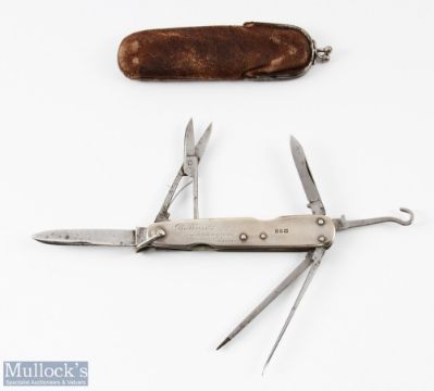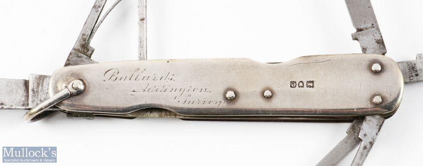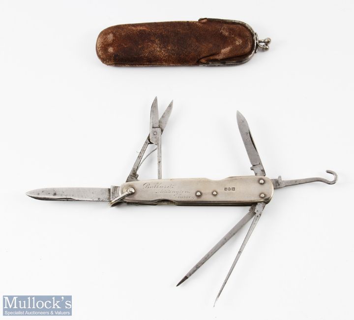 Victorian Hallmarked Silver Anglers Knife with partly stamped maker's mark - Lund of Cornhill, with former owners script engraving to side 'C H Goschen Ballards Addington Surrey', containing 6 folding implements including large blade, small blade, scissors, hook, file and stiletto, knife body hallmarked London 1900, together with original leather case. Charles Hermann Goschen was the son of Wilhelm Heinrich Goschen and Henrietta Ohmann, who held office of Lord Lieutenant of London and was Chairman of Lloyds.