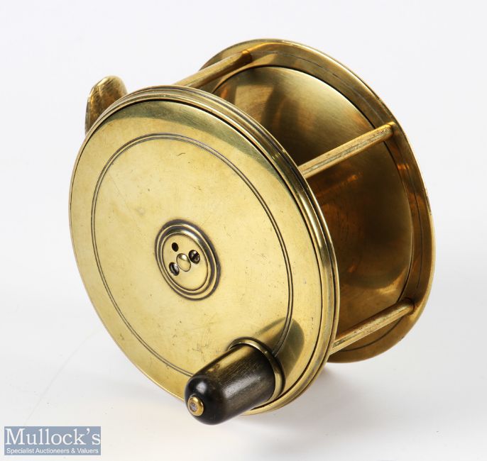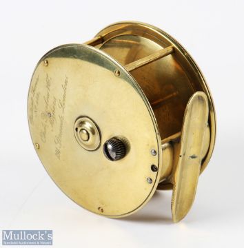 Chas Farlow, Maker, 191 The Strand, London, brass plate wind reel, stamped Patent Lever No 453, 4" spool with large domed handle, constant check with unusual rear mounted milled steel tensioner with central slot. Runs well, looks original