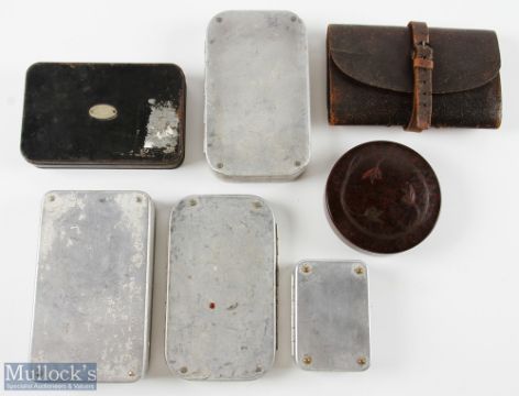 Selection of Fly Tins and Flies inc Hardy May Fly box, 3x Kilroy patent boxes, 1x Wheatley, 1x Farlow and another pocket sized Wheatley box with flies, C Farlow tin with flies, Hardy 'Album' bakeltite cast carrier and leather fly wallet (7)