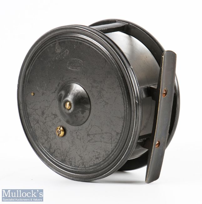 Robert Turnbull Edinburgh, alloy salmon fly reel, 4.5" wide spool with large brass mounted handle, five pillar frame, constant check, very clean, fabulous noise!