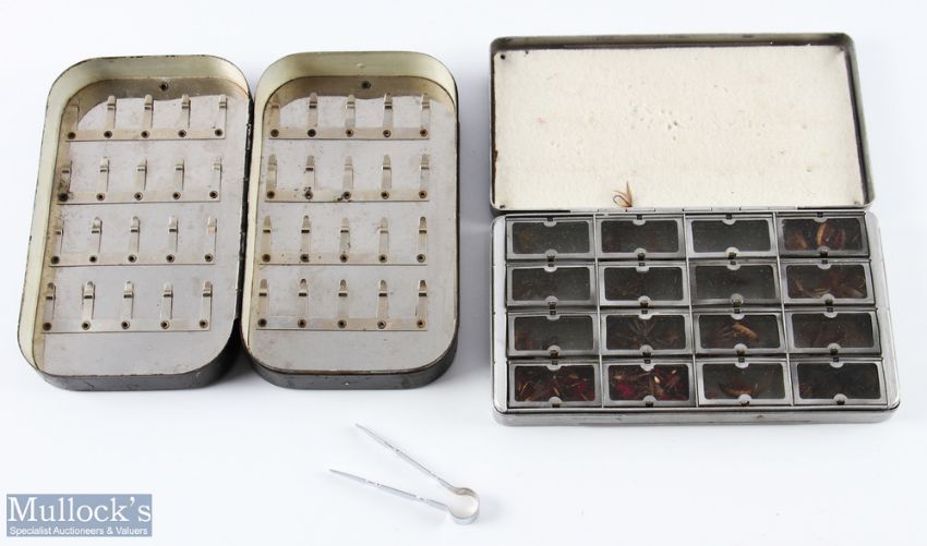 Deep Salmon Japanned Fly Box, 40 clips and a Terrys tweezers, plus an Allcock's style aluminium 16 compartments fly tin with a selection of dry fly with sprung lids (2)