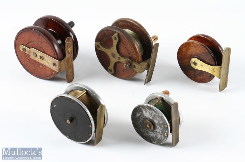 3x unnamed brass/mahogany reels, all complete; 2x brass and ebonite plate wind unnamed reels (5)