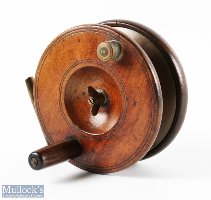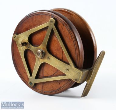 Wooden and Brass 6" Diamond back Nottingham Reel with extended wooden handle with counterbalance, brass flange, rear check on/off, runs smooth, 2 small cracks to rim otherwise good