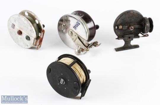 Alvey Model 35 side casting centre pin reel, 3.25" spool, twin handles, on/off check, all complete (needs a clean); Leeda LC100 composite cartridge fly reel 3.5" spool, press button latch, rim mounted slide tensioner, light use; Allcocks alloy centre pin reel 3.5" caged spool with twin handles, on/off check, runs okay; S Allcocks Redditch Stanley Threadline reel Patent 375861 and 1755195, all original, need a service and clean (4)