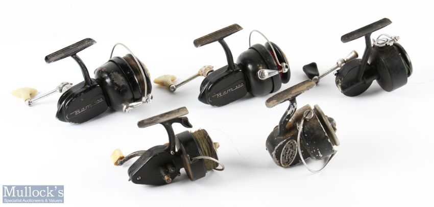 2x Peerless BAM 300 fixed spool reels, good bail, LHW, both run well; Mitchell 314 fixed spool reel, good bail, runs okay; K P Morritts Intrepid-de-Luxe fixed spool reel, good bail; Helical casting reel - there may be a part worth having!! (5)