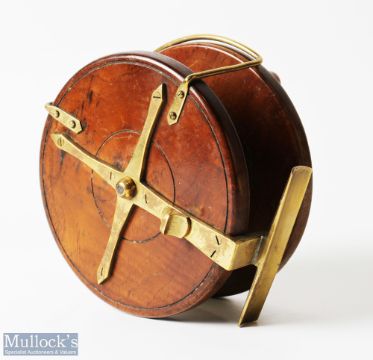 J Bernard London Star Back mahogany salmon reel, 5" wide spool with brass rear flange, Slater style brass latch and twin large bone handles on brass mounts, on/off check, brass Bickerdyke style line guide, runs well