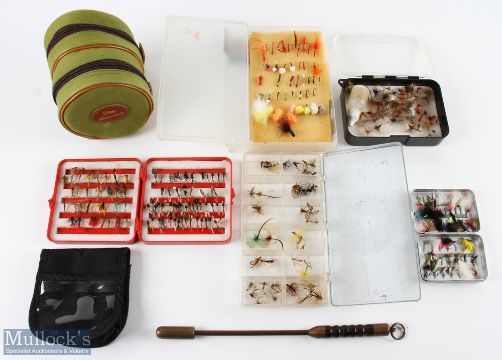 4x Plastic Fly-Fishing Boxes with a good selection of tradition dry and wet tout flies and lures, plus a Wheatley Slimalloy tin with 54 clips, a homemade brass headed priest, a dragon tackle double reel case and Grays reel case