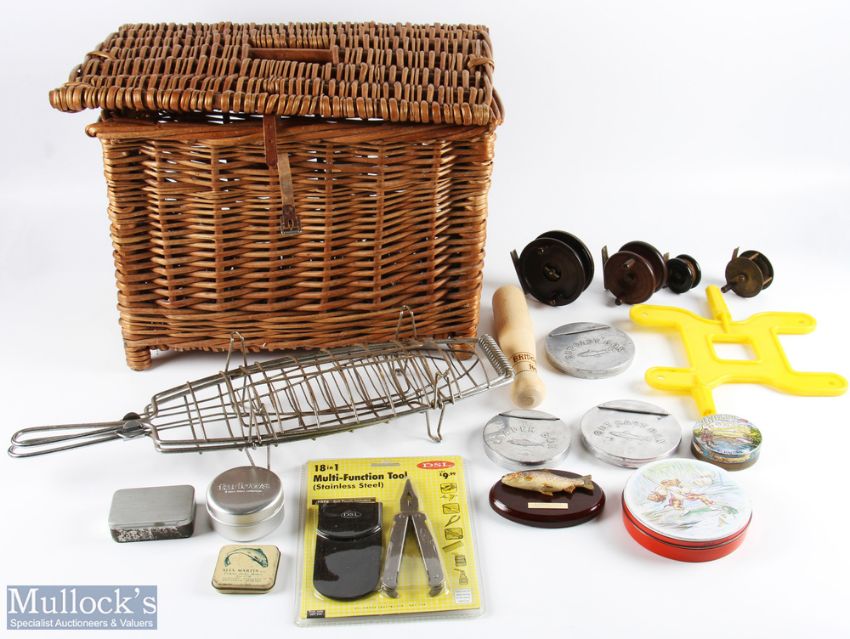 Wicker Fishing Creel 18" x 12" x 13" with shoulder strap and leather buckle, light use, containing: 2x fish grill/frames, 4x small reels, large line winder, 3x gut cast tins, new multi-function tool, Bridge House Hotel wood priest, various small tins, small trout on oval stand