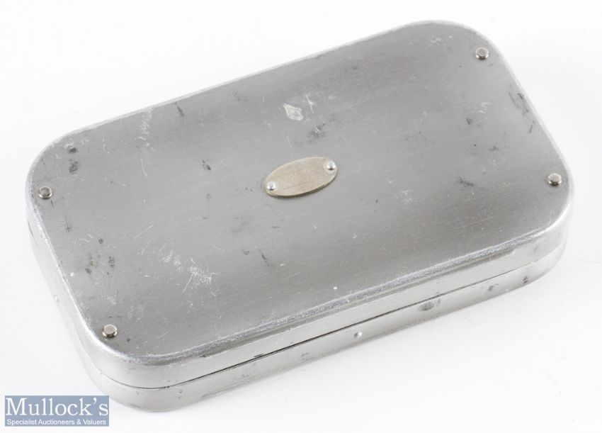 Hardy Alnwick fly tin by Richard Wheatley with Hardy badge to lid, 6" x 3.5" for salmon flies, 40 large clips with 40 fully dressed single salmon hooks up to size 5/0, all look very fishable