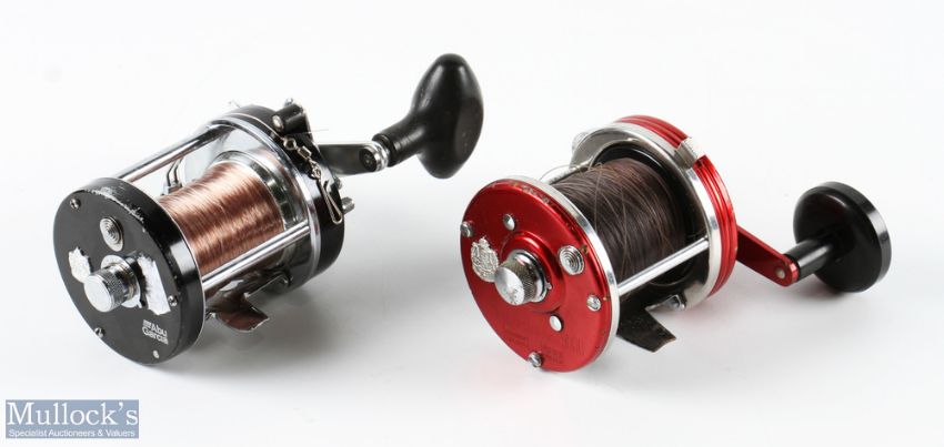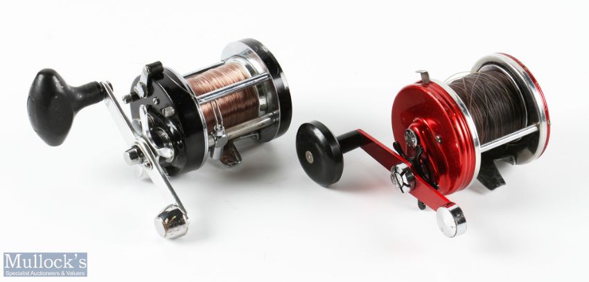 ABU Ambassadeur 9000 Multiplier Reel in red with counterbalance handle, check on/off, with another ABU Garcia AG Seven multiplier reel in black, both showing signs of use and wear, both run smooth (2)