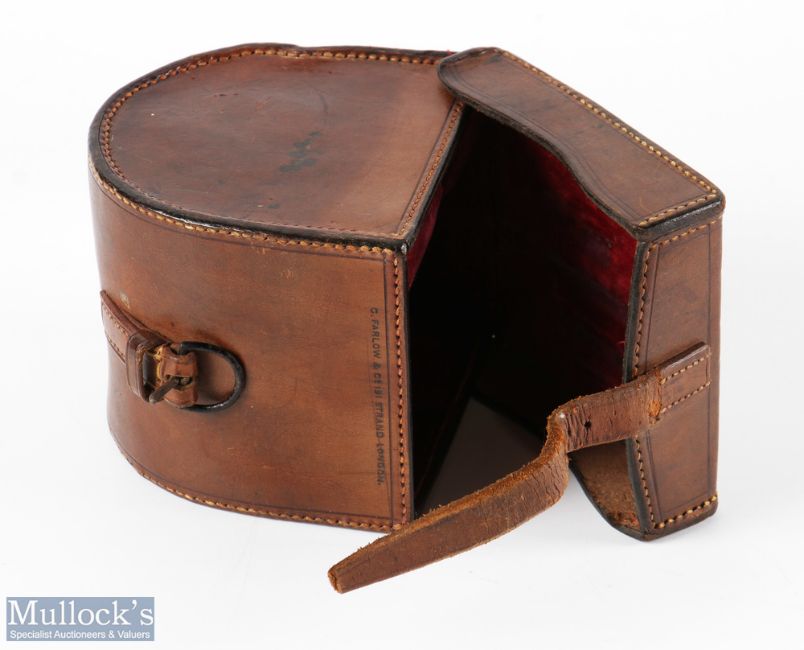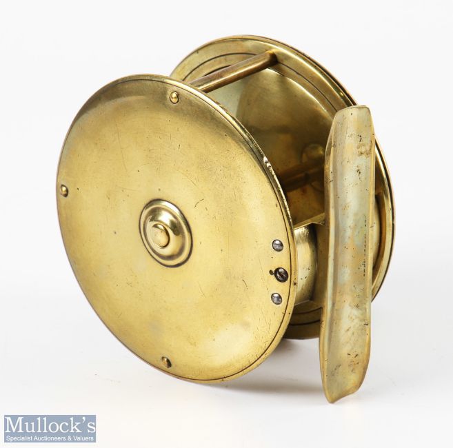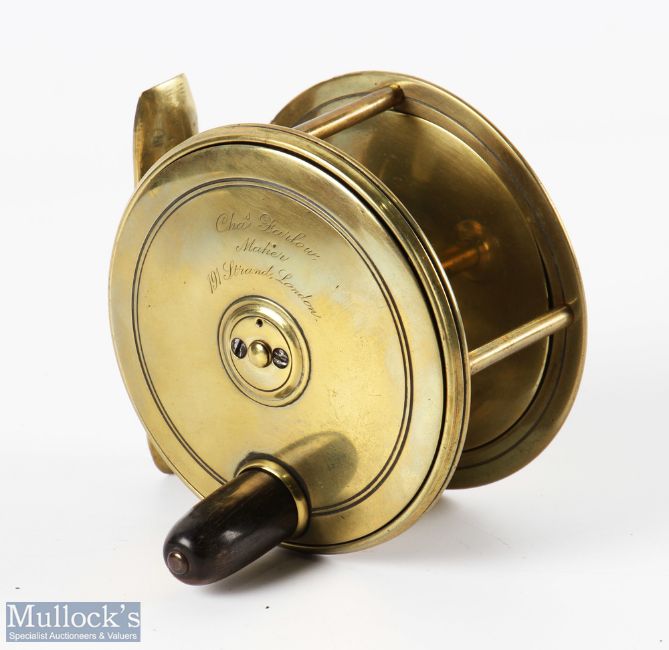 Chas Farlow Maker, 191 The Strand, London, brass plate wind trout fly reel, 3.5" wide spool with large domed bone handle, 3 pillar construction, runs well with D shaped block leather Farlow reel case, good stitching strap and buckle, small dent to one seam, very nice duo