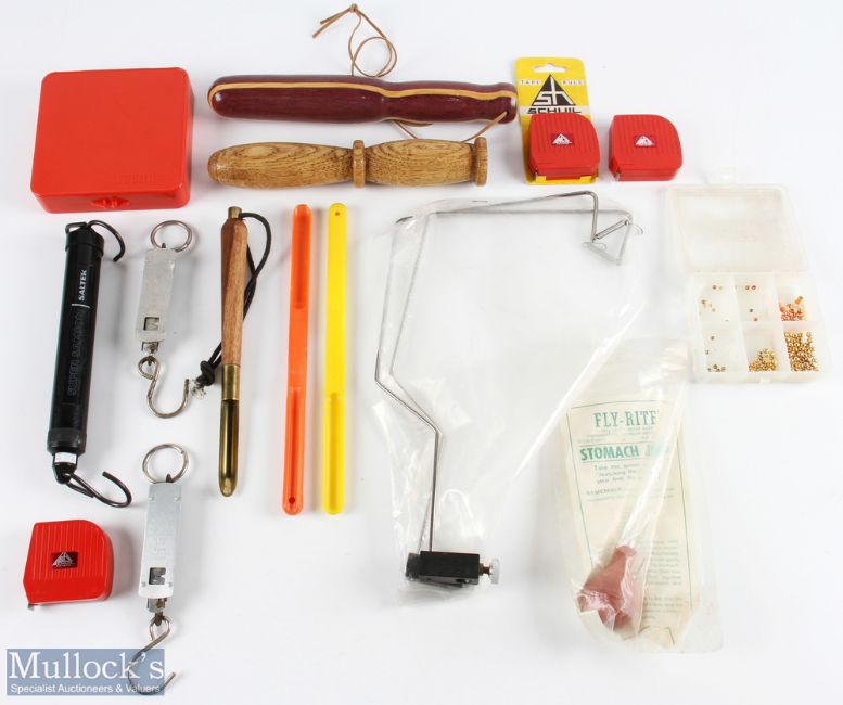 Selection of: 2x hand turned priests; 3x spoons; Flyrite stomach pump; 2x Little Samson scales - 4lb/7lb; Salter Super Samson 2kg; 2x vice gallow tools; 3x tape measures (14)