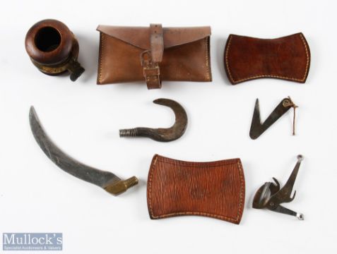 Fishing Accessories - brass ring tackle retriever together with hardwood thumb spool and line. Three other tackle retrievers in leather cases including a Cummins "The Periscope" Fly Releaser and a 5" blade in the shape of a scythe (5)