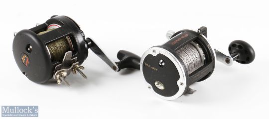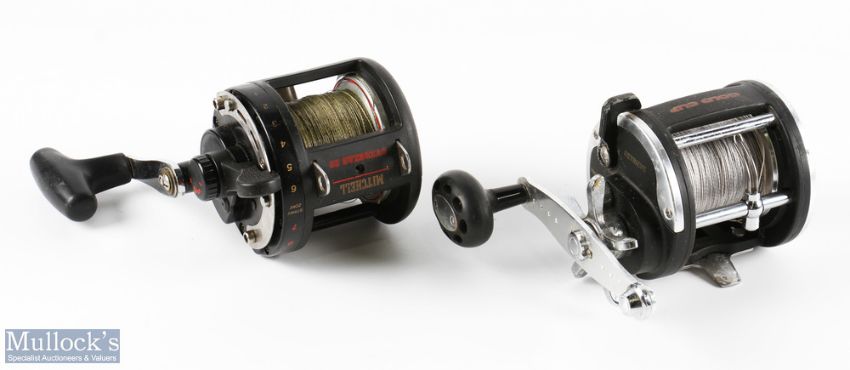Mitchell Overseas 20 Multiplier Reel in black finish with black handle, with drag adjuster and check on/off, together with Offshore Angler GCL-30 with sliding line guide and counterbalance handle, both run smooth with signs of wear. (2)