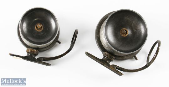 2x Malloch's Patent Sidecaster Reels in alloy with black handles, brass twisting foot and line guides, both stamped to face plate, rear dia.'s 3 7/8" and 3 3/8" (2)