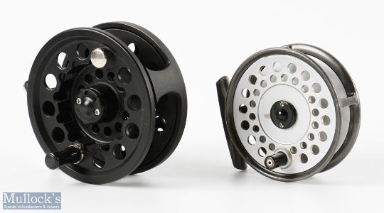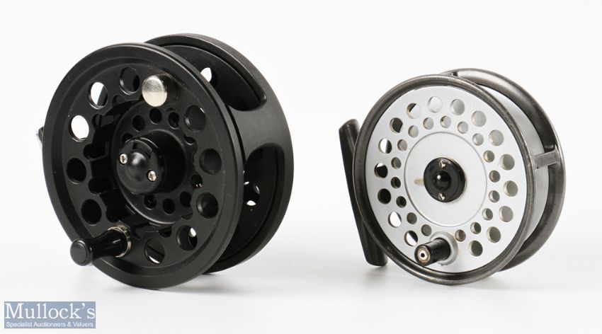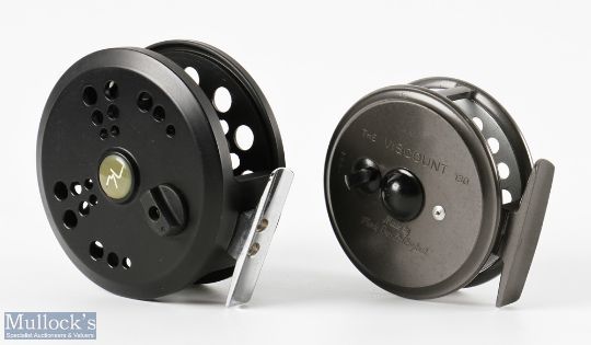 Hardy "The Viscount 130" alloy trout fly reel, 2-screw latch, rear tensioner, runs very well, zip case; unnamed alloy fly reel, 3.75" spool, counterbalanced handle, rear tensioner, runs very well (2)