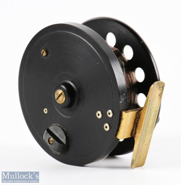 Unnamed Aerial 3.75" Fly Reel in black finish, twin black handles, 6 spoke centre, brass foot, rear check on/off, good overall condition, runs smooth