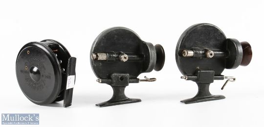 2x Allcock Stanley Threadline Reels one having bakelite spool the other wooden, together with Allcocks Aerialite 3.25" fly reel in black finish and makers box (3)