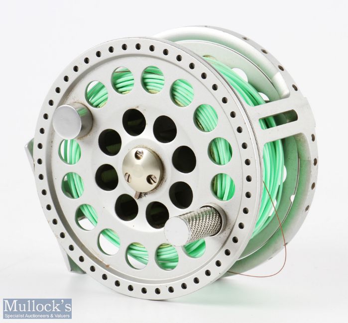 Hardy Angel 11/12 Disc Drag Spey Reel counterbalance handle, ventilated spool, rear disc drag, with WF-S tip Spey line, runs smooth, with House of Hardy pouch
