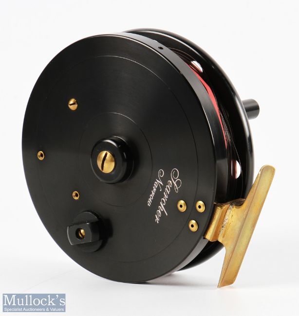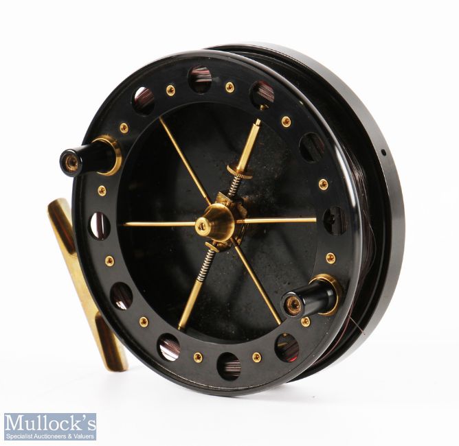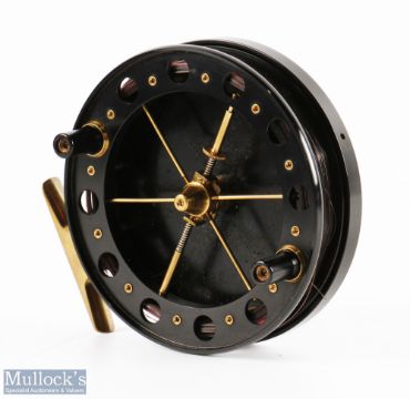 Aerial 'Searcher Narrow' 4.5" Reel in black finish, twin handle, 8 spoke, brass foot, rear check on/off, overall very good condition
