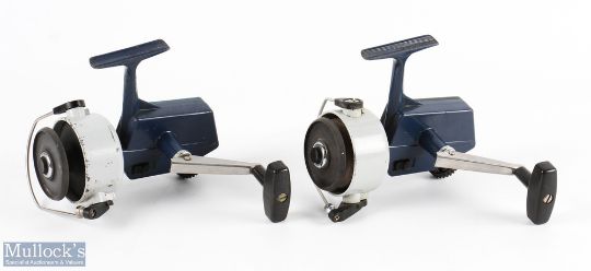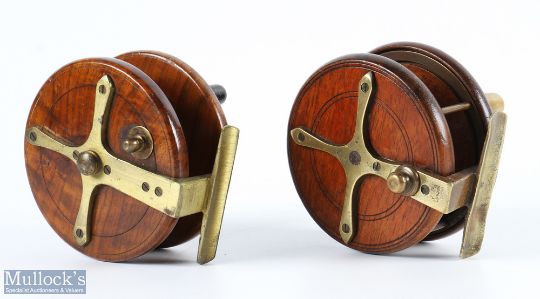 Abu Cardinal 60 fixed spool spinning reels, LHW, both have good bails and run well, one shows signs of wear (2); Carter & Co London mahogany star back reel, 4" spool with brass flange, twin oversize handles on brass mounts, Slater style latch, 4 pillar frame, on/off check, runs very well; unnamed mahogany star back reel 4" spool, twin handles on brass mounts, Slater style latch, on/off check, runs very well (3)
