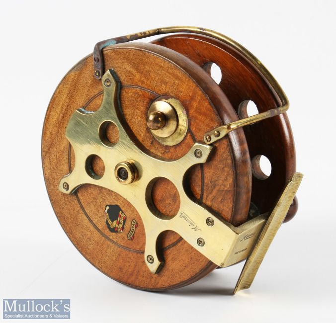 A fine Millwards Frogback mahogany and brass Nottingham style reel, 6" wide spool with brass rear flange twin bulbous brass mounted handles and ported face, on/off check (what a noise!), runs very well