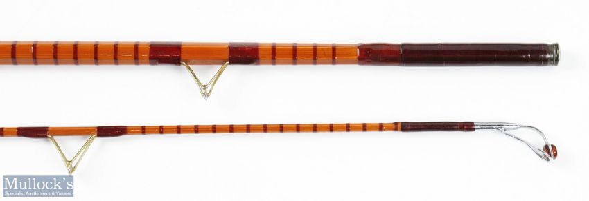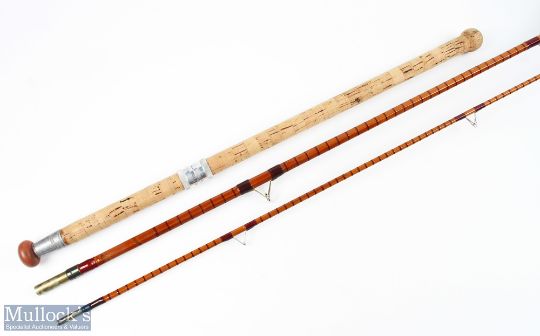 B James & Son London split cane float rod 11' 6" 2pc with 24" detachable mushroom handle with alloy sliding fittings, stand off rings, with red agate butt/tip rings, refurbished MCB