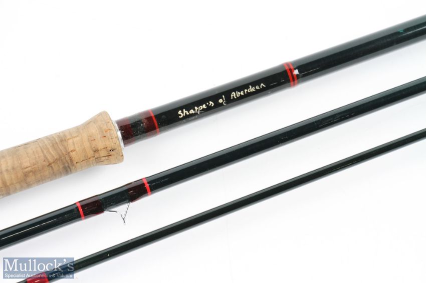 Sharpe's Aberdeen Aquarex carbon salmon rod 15' 3pc line 10#, 25" handle with double down locking alloy reel seat with wood insert and collars, red agate lined stripping rings and tip, cloth bag and silver pin, hard tube