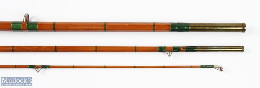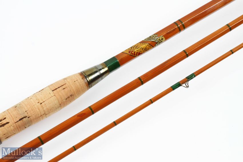 Allcocks Eclipse built cane match rod supplied by Keane's of Plumstead 11' 3pc 20" handle with brass sliding reel fittings and collars, red agate butt/tip rings, looks very original, cloth bag