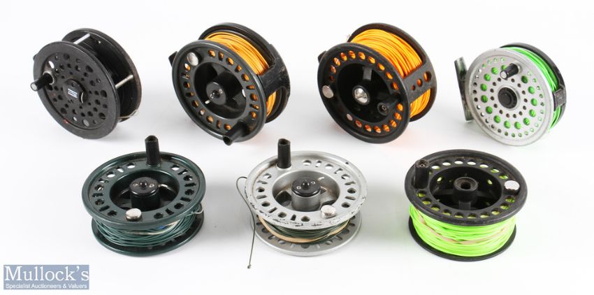 Okuma Airstream 7/9 composite fly reel with spare spool, 3.75" wide spool, counterbalance handle, rear tensioner, runs well; unnamed fly reel 7/8 with 2 spare spools, 2 screw latch with counterbalanced handle, rear tensioner, runs well; Ryobi 355 MG Superlight Magnesium fly reel 3 3/8" spool, push button release rear tensioner, runs well; Shakespeare 2755 graphite fly reel, 3.5" spool, runs well (4)
