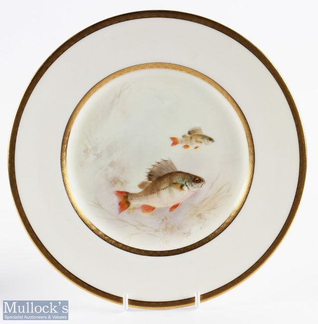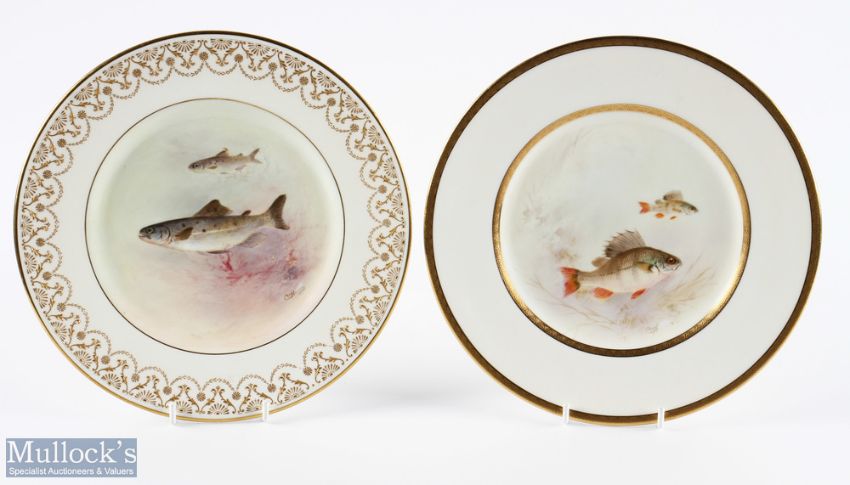 2x Royal Doulton Fish Plates: of Perch Salmon, both with rubbed signatures C H, a jewelled plate with back stamp Tiffany Company, both 24cm diameter
