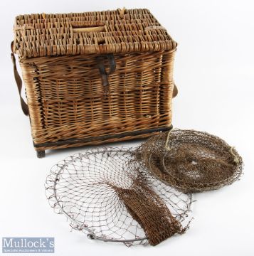 Large Coarse Wicker Fishing Tackle Basket measuring 45cm x33cm x35cm approx. comes with a small keep net inside, appears in fair-good condition overall