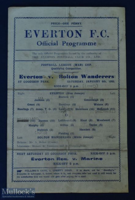 1944/45 Everton v Bolton Wanderers football league war cup qualifying single sheet match programme; has a crease, pencil team changes. (1)
