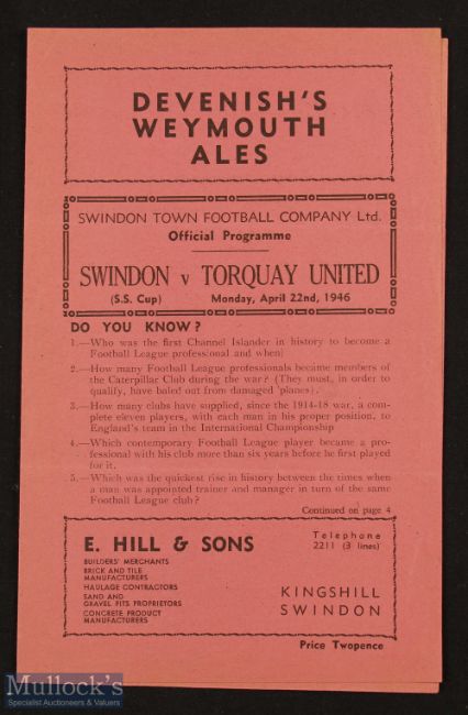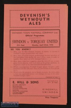 1945/46 Swindon Town v Torquay United, S.S. cup match programme 22 April 1946; 4 pager, good condition.