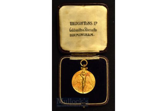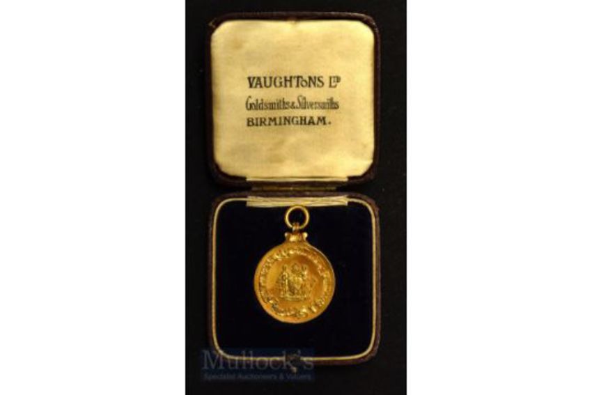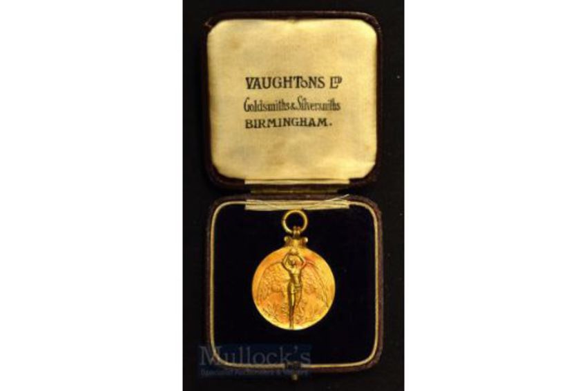 1932 Jimmy Murphy Awarded Birmingham County FA Charity Cup 9 carat gold medal to the obverse the coat of arms, to the reverse a depiction of an angel catching a football; 9 carat gold, 15 grammes, has original box by Vaughtons of Birmingham.
