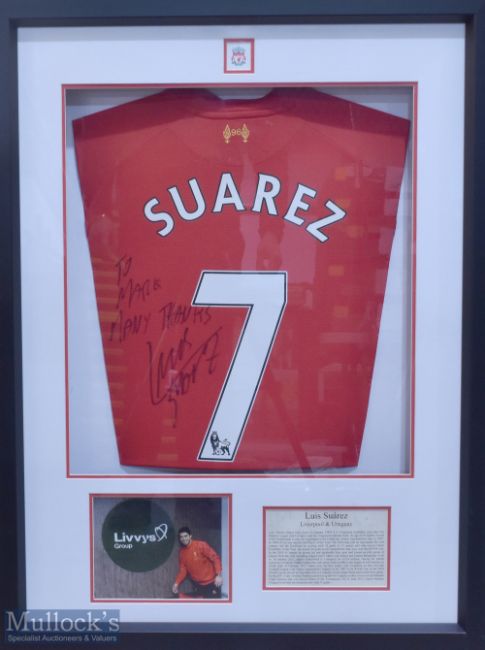 Luis Suarez Signed Liverpool FC Home replica Football Shirt in red, signed to the reverse 'To Mark, Many Thanks Luis Suarez', Suarez No7 to reverse, finely presented and professionally framed, measures 65x87cm approx.