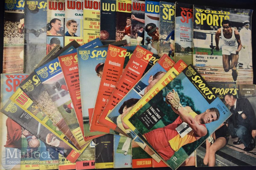 Selection of World Sports magazines from 1956 onwards into the 1960s (not continuous); football noted on earlier ones to include 1956 (Jan) Johnny Haynes, 1956 (May) Jeff Hall, 1957 (Sept) Derek Tapscott, 1957 (Dec) Stan Matthews, 1958 (Jan) Bryan Douglas, 1958 (Feb) Eddie Hopkinson, 1958 (March) Tommy Harmer, 1958 (Nov) Derek Kevan & Frank O'Farrell, 1958 (Dec) Billy Wright. Total (55+) generally fair.