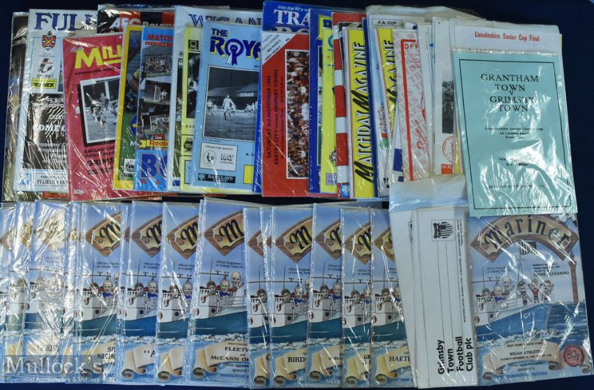 Grimsby Town home match programme collection to include 1986/87 Div. 2 homes complete season (21) + Stoke City (FAC) + Carlisle Utd (Littlewoods) + Hull City (Littlewoods) + Hull City (FMC) + Sheffield Wednesday (testimonial) + Brondby (friendly) + Scunthorpe Utd (Lincs. Snr. Cup final); 1986/87 aways complete season (21) + Stoke City (FAC), Stoke City (FAC 2nd replay-single sheet), Carlisle Utd (Littlewoods), Hull City (Littlewoods), Boston Utd (Lincs. Snr. Cup s/f) + Icelandic Tourny programme 5-12 August 1986; 1987/88 Div. 3 homes complete season (23) + Halifax Town (FAC), Darlington (Littlewoods) + Halifax Town (Freight Rover) + Scunthorpe Utd (Freight Rover) +Southampton (benefit) + Sheffield Wednesday; 1987/88 aways complete season (23) + Halifax Town (FAC), Scarborough (FAC) + Darlington (Littlewoods) + Scunthorpe Utd (Freight Rovers); 1988/89 Div 3 homes complete season (23) + Reading, Rotherham Utd, Wolves (all FAC) + Rotherham Utd (Littlewoods) + Huddersfield Town (Sherpa Van) + Rotherham Utd (Sherpa Van) + Lincoln City (Lincs. Snr. Cup) + Bradford City (Yorks & Humberside) + Halifax Town (Yorks & Humberside); 1988/89 aways complete season (23) + Middlesbrough (FAC) + Reading (FAC) + Wimbledon (FAC) + Rotherham Utd (Littlewoods) + Doncaster (Sherpa Van) + Rotherham Utd (Yorks & Humberside) + Goole Town, Immingham Town (friendlies) 1989/90 Div. 4 homes complete season (23) + Doncaster (FAC) + Coventry City (Littlewoods) + Hull City (Littlewoods), York City, Huddersfield Town, Barnsley (all Yorks & Humberside cup) + Huddersfield Town (Leyland Daf) + Spalding (Lincs. Snr. Cup) 14 November '89 + 2 May '90 programmes, Oldham Athletic (friendly); 1989/90 aways complete season (23) + Huddersfield (FAC) + York City (FAC) + Hull City (Littlewoods), Coventry City (Littlewoods) + Doncaster Rovers (Leyland Daf) + Gainsborough Trinity (Lincs. Snr. Cup s/f) + Long Sutton (friendly); 1990/91 Div 3 homes complete season (23) + Blackpool (FAC) + Crewe Alexandra (Rumbelows) + Darlington (Leyland Daf) + Bradford City (Yorks & Humberside Cup) + Bourne Town, Sutton Town, Oadby Town (all friendlies) + Boston Utd (Lincs. Snr. Cup), Lincoln City (Lincs. Snr. Cup final 21 November '90) Grantham Town (Lincs. Snr. Cup), Lincoln City (Lincs. Snr. Cup final 13 May '91); (a qty)