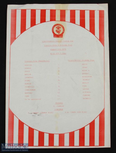 1979/80 Lincoln City v Grimsby Town Lincs. Senior County Cup match programme 6th August 1979, large single sheet issue; fold, slight mark, scarce issue.