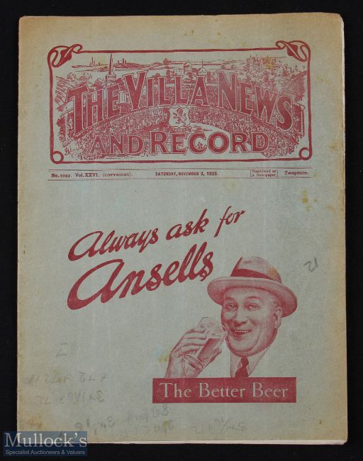Pre-War 1935/1936 Aston Villa v Grimsby Town Div. 1 match programme 2 November 1935; slight tear, back page has a small corner tear (small paper loss), o/all fair.