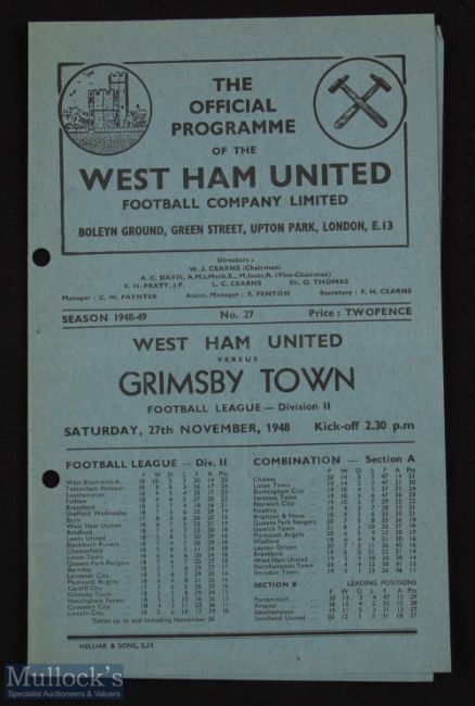 1948/49 West Ham Utd v Grimsby Town Div. 2 match programme 27 November 1948, match abandoned; neat punch holes, team changes.