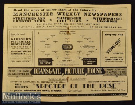 1946/47 Manchester United v Derby County Football Programme date 9 Nov, centre fold, small tears at fold, pencil team changes, staple rust/bleed,