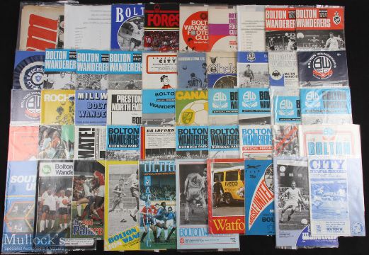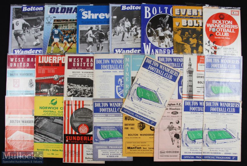 Comprehensive collection of Bolton Wanderers match programmes in the Football League Cup to include 1960/61 Rotherham Utd (h), Grimsby Town (h), Hull City (h), Darlington (a), Hull City (a), 1961/62 Sunderland (h), Sunderland (a) (ph), 1962/63 Norwich City (a) 1963/64 Sheffield Utd (a), 1964/65 Blackburn Rovers (h), 1965/66 Grimsby Town (a), Aldershot (h), 1966/67 Manchester City (a), 1967/68 Liverpool (h), WHU (a), Liverpool (a), 1968/69 WHU (a), 1969/70 Rotherham Utd (h), Rochdale (h), Rotherham Utd (a), Rotherham Utd (2nd replay-single sheet 11.9.1969), 1970/71 Blackburn Rovers (h), Leicester City (h), Leicester City (a), 1971/72 Bradford City (h), Manchester City (h), Chelsea (h), Bradford City (a), Huddersfield Town (a), Chelsea (a), 1972/73 Oldham Athletic (h), Sheffield Wednesday (a), 1973/74 Preston NE (h), Millwall (h), Rochdale (a), Millwall (a), Preston NE (a), 1974/75 Norwich City (h), Norwich City (a), 1975/76 Coventry City (h), 1976/77 Swansea (h), Fulham (h), Everton (FLC s/f) (h), Swansea (a), Fulham (a), Fulham (a) 2nd replay, Bradford City (a), Derby County (a), Everton (FLC s/f) (a), 1977/78 Leeds Utd (h), Peterborough Utd (h), Lincoln City (h), 1978/79 Chelsea (h), Exeter City (a), 1979/80 Southend (h), Southend (a), 1980/81 Crystal Palace (h) & (a), 1981/82 Oldham Athletic (h) + (a), 1982/83 Carlisle Utd (a), Watford (h) & (a), 1983/84 Chester City (h) & (a), 1984/85 Oldham Athletic (h) & (a), Shrewsbury Town (h) & (a), 1985/86 Stockport County (h), Stockport County (a) single sheet, Nottingham Forest (h) & (a), 1986/87 Bury (h) & (a), 1987/88 Wigan Athletic (h) & (a), 1988/89 Chester City (h) & (a), 1989/90 Rochdale (h) & (a), Swindon Town (h) & (h replay), Swindon Town (a) & (a) (replay), Watford (H) & (a) 1990/91 Rumbelows Coventry City (h) & (a), Huddersfield Town (h) & (a), 1991/92 Nottingham Forest (h) & (a), York City (h) & (a), 1992/93 Coca-Cola Port Vale (h) & (a), Wimbledon (h) & (a), 1993/94 Bury (h) & (a), Sheffield Wednesday (h) & (a), 1994/95 Ipswich Town (h) & (a), WHU (a), Sheffield Utd (a), Norwich City (h), Swindon Town (Coca-Cola s/f's) (h) & (a), Liverpool (Final at Wembley), 1995/96 Leicester City (h) & (a), Norwich City (h) & (a), Brentford (h) & (a), 1996/97 Bristol City (h) & (a), Chelsea (h), Tottenham Hotspur (h), Wimbledon (h), 1997/98 Leyton Orient (h) & (a), Middlesbrough (a), Wimbledon (h), 1998/99 Worthington Cup, Wimbledon (h), Hartlepools Utd (h) & (a), Hull City (h) & (a), Norwich City (a) 1999/2000 Wimbledon (h), Sheffield Wednesday (h), Gillingham (h), Darlington (h) & (a), Derby County (a), Tranmere Rovers (Worthington Cup s/f), (h) & (a), 2000/2001 Macclesfield (h) & (a), 2001/2002 Southampton (h), Nottingham Forest (h), Walsall (h), Tottenham Hotspur (a), 2002/2003 Bury (h), 2003/2004 Carling Southampton (h), Gillingham (h), Walsall (h), Aston Villa (h) & (a) (Carling Cup s/f), Liverpool (a), Middlesbrough (at Millennium Stadium) (Carling Cup final), 2004/2005 Yeovil Town (a), Tottenham Hotspur (h), 2005/2006 Leicester City (h), West Ham Utd (h) + directors hospitality package at WHU including ticket, Wigan Athletic (a), 2006/2007 Walsall (a), Charlton Athletic (a), 2007/2008 Manchester City (h), Fulham (a), 2008/2009 Northampton Town, 2009/2010 WHU (h), Chelsea (a), Tranmere Rovers (a), 2010/11 Southampton (a), Burnley (a), 2011/12 Macclesfield Town (h), Arsenal (a), Aston Villa (a) 2012/13 Crawley Town (a), 2013/14 Swansea City (a), Shrewsbury Town (a), 2014/15 Bury (h), Crewe Alexandra (a) (14 autographs to cover), Chelsea (a), 2015/16 Burton Albion (h); fair/good condition, the collection has a high catalogue value and is available with a very competitive estimate for the collector/dealer to contemplate. (1 box of quantity as listings)