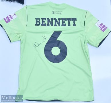 2013/14 Forest Green Rovers Signed Match Issued Football Shirt Bennett No 6, signed to the front and back by Bennett, in green, short sleeve, arm badges, size L together with 2x Scarves (3)