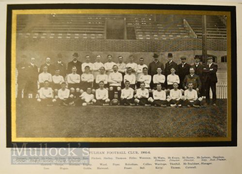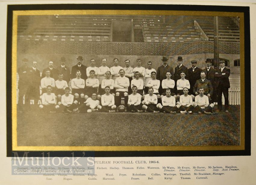 1905/1906 Fulham team photo postcard (by Moyse of Putney) players named; also magazine photo of Fulham 1905/1906 full squad & directors. (2) Good.