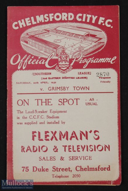 Scarce pre-war 1938/1939 Chelmsford City v Grimsby Town friendly match programme 29 April 1939; good condition, has single sheet season ticket application inside.
