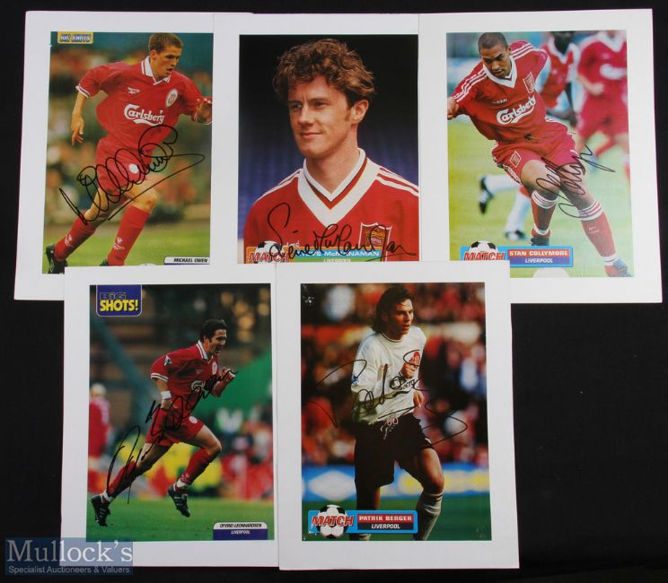 Liverpool FC Autograph Displays (5) featuring Michael Owen, Steve McManaman, Stan Collymoore, Oyvind Leonhardsen and Patrik Berger all on colour magazine cut outs, laid to card, ready to frame and display - each measuring 29x35cm approx