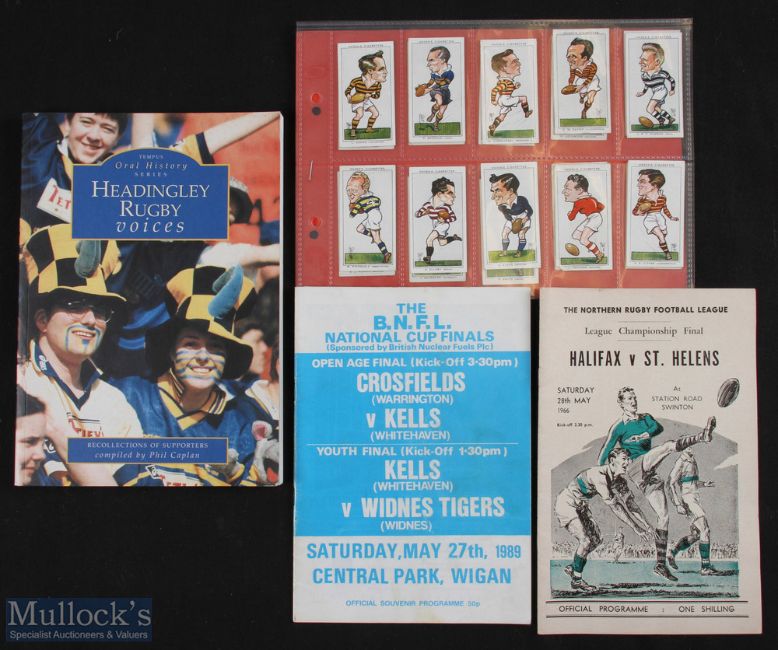 Rugby League Selection features 1966 Halifax v St Helens Championship Final programme 28 May 1989 B.N.F.L National Cup Finals 27 May, Headingley Rugby Voices History Book, plus a selection of Ogden's Cigarettes Football Caricatures 31-50 noted (4)